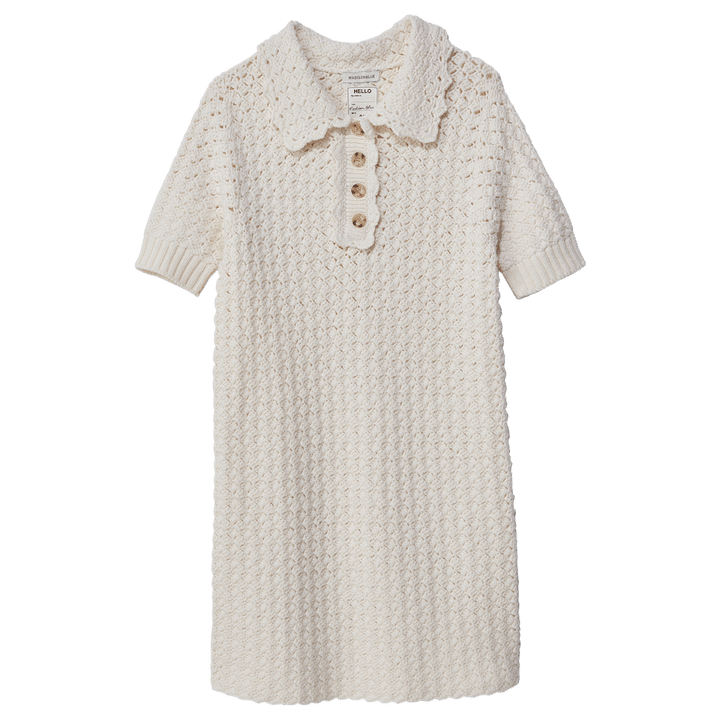 「クロシェ編みのミニドレスはマディソンブルーでこの甘さっていうところがいい!」
