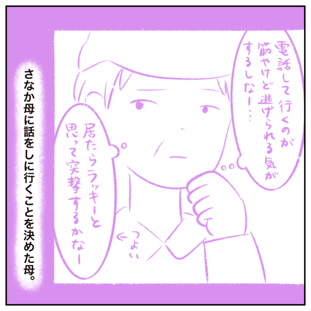 本来なら電話してたずねるのが筋だと思いつつ、「逃げられる気がするしな・・いたらラッキーと思って突撃するかな」と考えたまるさんのお母さん。