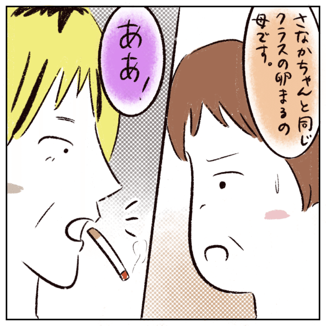 「さなかちゃんと同じクラスの卵まるの母です」お母さんが名乗ると「ああ!」と声を上げるさなかちゃんのお母さん。