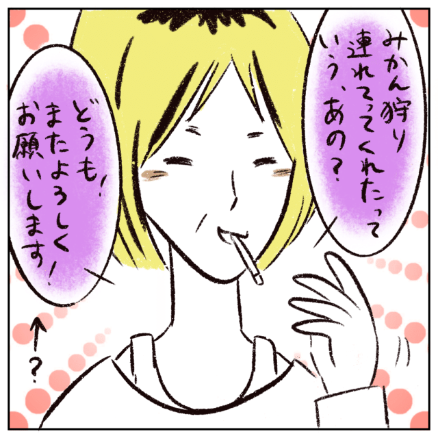 そして、「みかん狩り連れてってくれたっていう、あの?どうも!またよろしくお願いします!」そう言い出したさなかちゃんのお母さん。