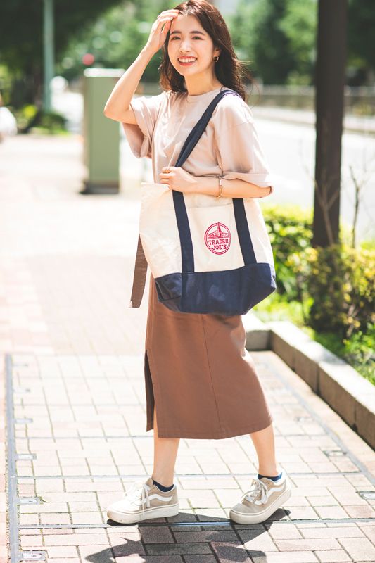 休日にちょっと足を伸ばして高級スーパーへホムパの買い出しに行く途中の入江さん。「TRADER JOE’Sのトートバッグは、周りにも人気でアメリカへ行った時にいろんなバリエをストックしています」(入江史織さん 人材関係・30歳 158cm)