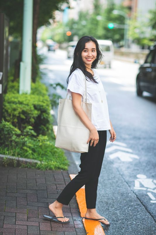ラフなビーサン&トートバッグコーデで撮影から展示会へ向かう途中の鈴木さん。「実はコレ、ハワイで靴を買った時に入っていたショッパーなんです。シンプルなデザインとマチのない縦長フォルムがオシャレだし、荷物が多くても少なくてもサマになるのでデイリーに使っています」(鈴木詩織さん・IT関連勤務・29歳162cm)