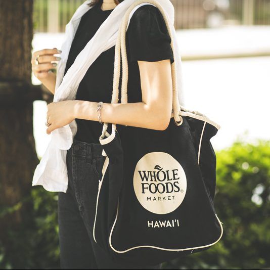 「このエコバッグは昨年ハワイでホールフーズで購入したもので、モノトーンなので主婦っぽくならないし、大容量で肩掛けもできるので普段使いにも重宝しています」