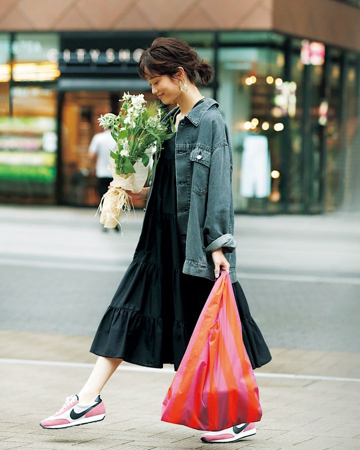 エコバッグ¥1,800(BAGGU/ピクニック)Gジャン¥9,500(Mila Owen ルミネ新宿2店)ワンピース¥48,000(マーレット/サザビーリーグ)スニーカー¥10,000(ナイキ スポーツウェア/NIKE カスタマーサービス)ピアス¥10,800(パズコレクティブ/ZUTTOHOLIC)ネックレス¥19,091(アビステ)