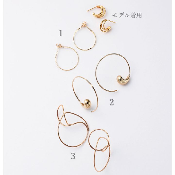 【静物】1 ピアス〈K18YG〉¥39,600(ココシュニック)2 ピアス〈SV925×K18YGコーティング〉¥33,000(アサミフジカワ/ショールーム セッション)3 ピアス〈K10YG〉¥104,500(ヒロタカ/ヒロタカ 表参道ヒルズ)【モデルカット】ピアス〈SV925〈K18YGプレーティング〉〉¥31,900(マリハ)トップス¥68,200(ハルノブムラタ/ザ・ウォール ショールーム)