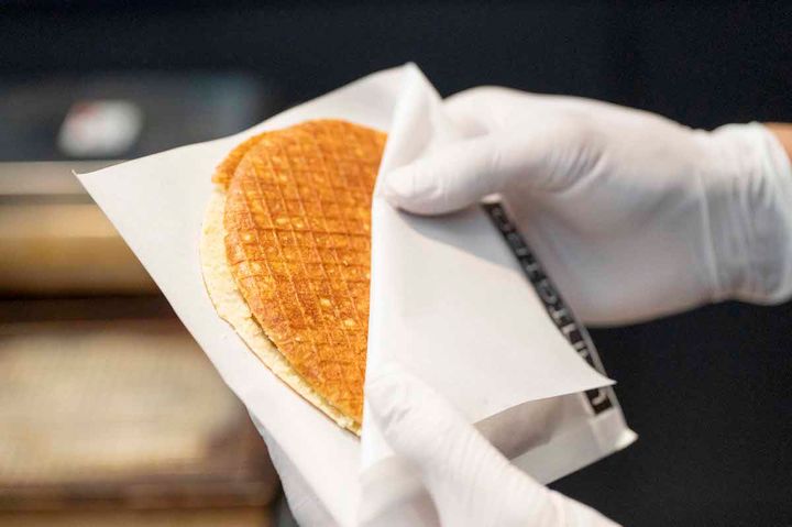 LANIGIROでは、日本ではちょっと珍しい焼きたての「ストロープワッフル」を店頭で販売しています。ストロープワッフルはオランダのワッフルの一種。生地を専用の鉄板で薄く焼き、半分に剥いで、その間にキャラメルなどを挟んだデザートです。