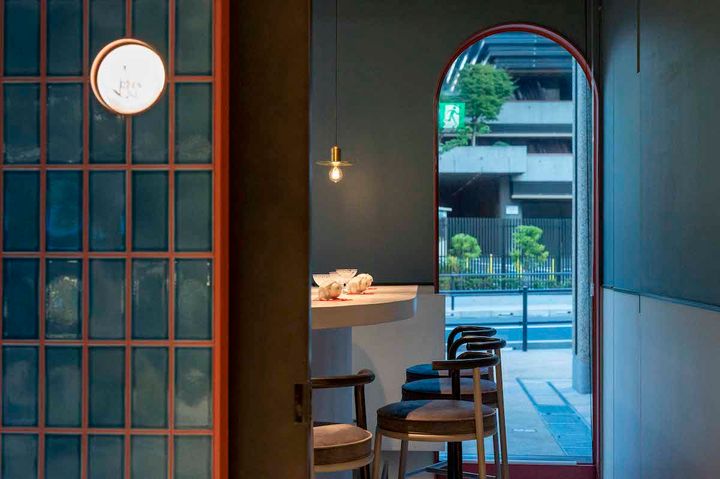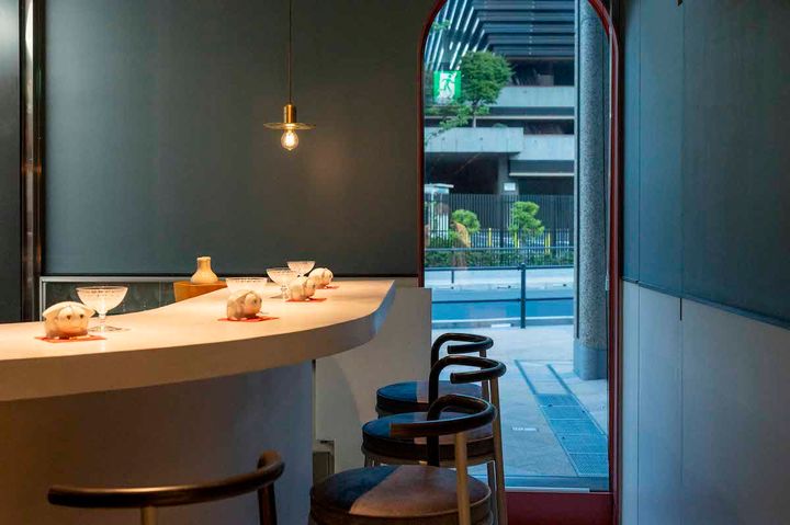 こちらはデセールレストランで、中は4席ほどのカウンターになっています。入り口が半円形の引き戸になっているのは、茶室をイメージしたとのこと。