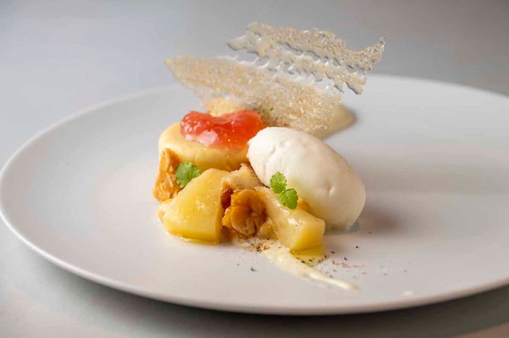 桃の甘さやラベンダーの香りと、ギリシャヨーグルトのソルベに入っているカルダモンの香りが合わさったエキゾチックな味わいに惹きつけられます。白桃のソテーやアーモンドのフィナンシェ、キャラメリゼしたナッツを添えて食感の楽しさもプラス。