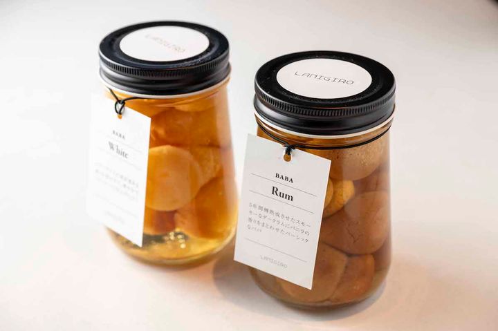 ファンの多いLANIGIROの人気商品をもうひとつ。ブリオッシュ生地にラム酒をたっぷりと染み込ませた「BABA」各2300円は、樽熟成のスモーキーラムを使った「Rum」とレモングラスを利かせたホワイトラムの「White」の2種類があります。