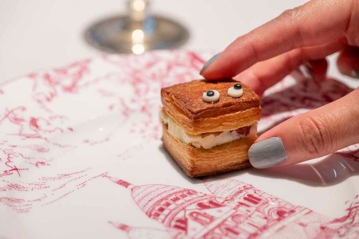 3皿目がこのデザートコースを代表するメニュー、名付けて「カロリーモンスター」! バターたっぷりのクロワッサン生地で、レーズンバターをサンドした魅惑的なひと口です。目がついてるのがかわいすぎます。