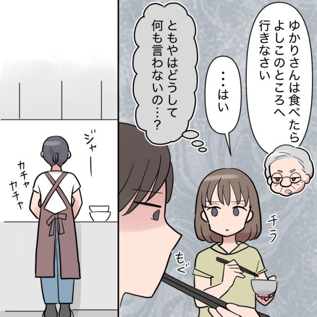 すると、「ゆかりさんは食べたらよしこの所へ行きなさい」義祖母に言われ「・・はい」と返事をしたゆかりさん、その時ともやさんの方を見るも、何も反応せずただ食べているだけの姿を見て、「ともやはどうして何も言わないの・・?」とゆかりさんには不審な気持ちが芽生えました。