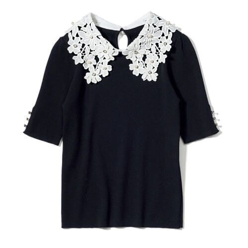 3. パール&レースつきや丸えりetc.きちんと感を与えつつ、小顔見えも狙える「えりつきトップス」