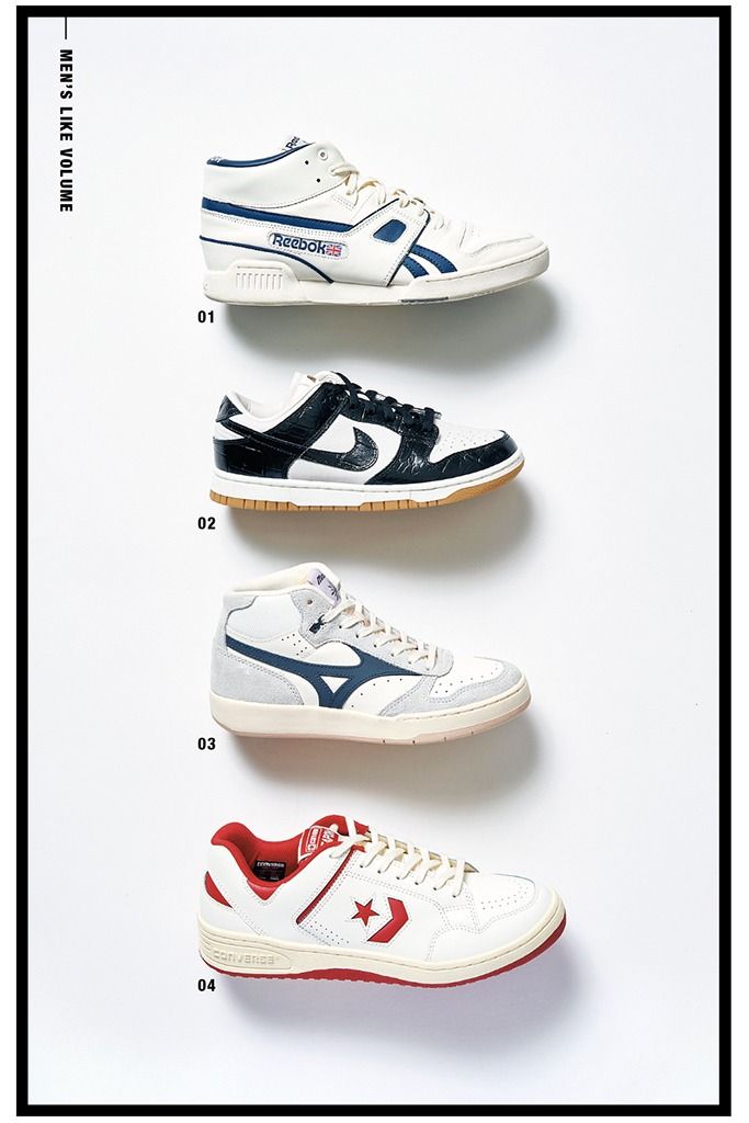 フォーマルな装いを日常にも浮かないオシャレに落とし込む「履くだけでかなう着くずし」。バスケットボールなど、スポーツシューズのモデルで選ぶと、ボリューム感やルックスが簡単に今っぽく。