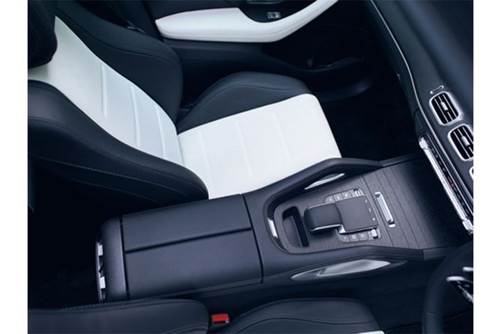 大胆なバイカラーのレザーシートが目を引く一方で、ダークなウッド使いがアクセントに。スポーティさと大人なムードが同居した、メルセデスならではの上質空間が広がります。