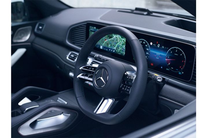 ステアリングは本革巻き。ディスプレーも見やすくて安心です。「ハイ、メルセデス」と呼びかけると相棒のように反応してくれるサポートシステムも、運転初心者には心強い!