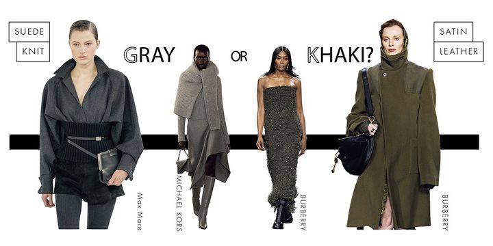 (渡邉さん)ハンサムなイメージのカーキやグレーも旬のツヤ素材をとり入れることで女性らしさをキープできる。異素材MIXでいうと、01.のルック・MICHAEL KORSはグレーのワントーンの中で顔まわりにニットを巻きつけたり、レザーのブーツでツヤのある質感を足したり、単調に見せない着方が参考になります。