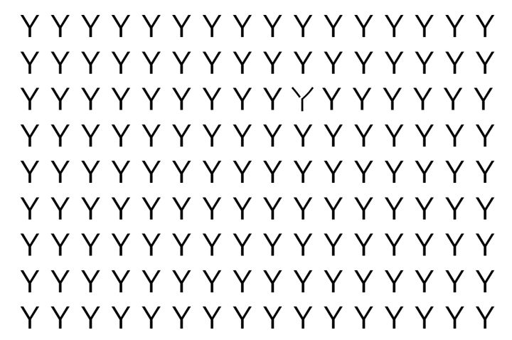 画像の中には、「Y」というアルファベットが縦に9行、横に16個並んでいます。 全部で144個となりますが・・・、そのうち1つは「異なる文字」となってますよ!!