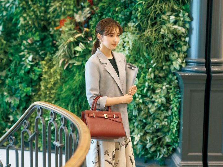 ジャケット¥17,940/JILL by JILL STUART ブラウス¥7,920/MISCH MASCH スカート¥25,300/ストロベリーフィールズ(シュガー・マトリックス) バッグ¥64,900/ケイト・スペード ニューヨーク(ケイト・スペード カスタマーサービス) パンプス¥30,800/銀座かねまつ(銀座かねまつ6丁目本店) イヤリング ¥8,800/アビステ 腕時計¥17,600/マトウ(エイチエムエスウォッチストア 表参道)