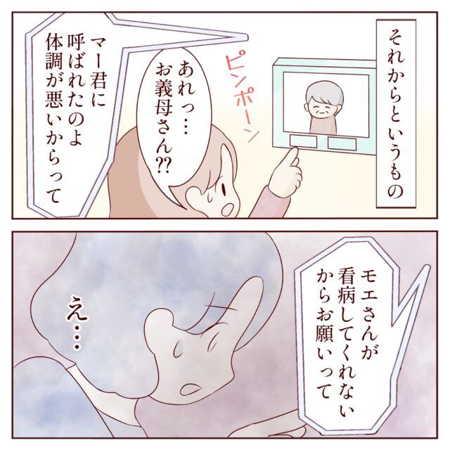 「マー君に呼ばれたのよ。体調が悪いからって・・・モエさんが看病してくれないからお願いって。」とお義母さんはモエさんに言ったのでした。