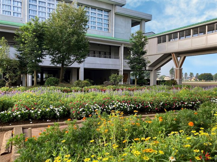 2013年から、生徒会と環境整備委員会を中心に、全校生徒157名、教職員、保護者、地域住民が協力して「花いっぱいの学校づくり」に取り組んでいます。生徒たちは土づくりから播種、育苗、植えつけ、水やり、花殻つみ、施肥、デザイン考案まで主体的に行い、年間8,000苗を育てています。