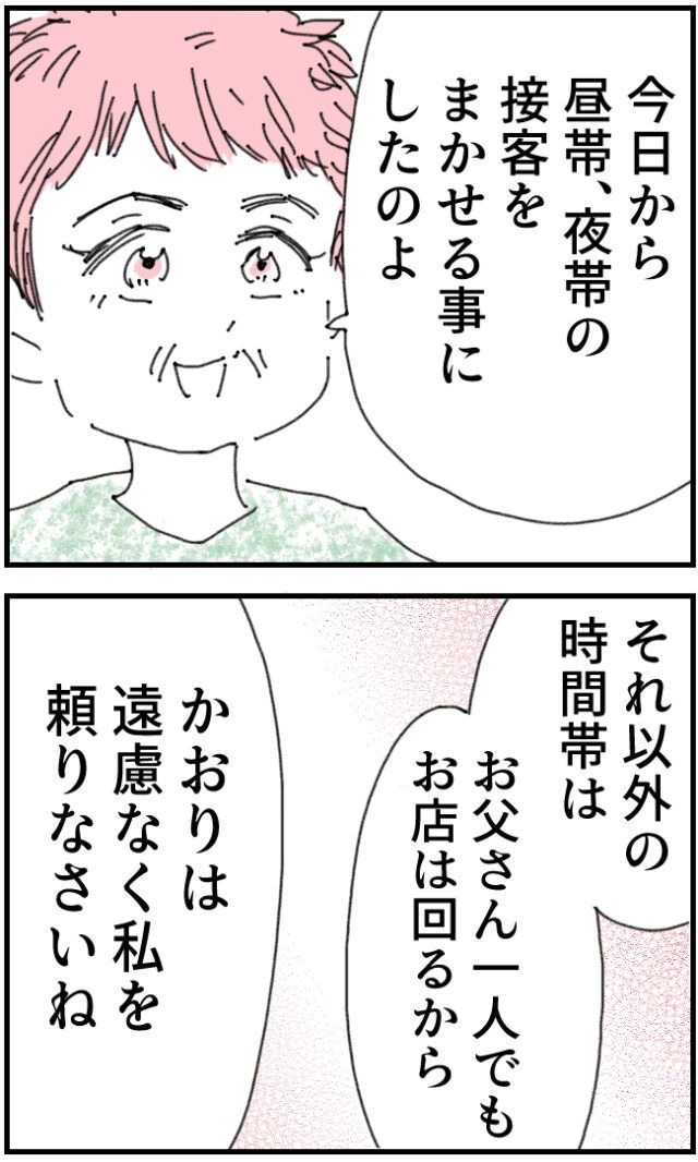 アルバイトさんに昼帯と夜帯の接客を任せることにしたと言い、「それ以外の時間帯はお父さん一人でも回るから。かおりは遠慮なく私を頼りなさいね」とお母さんは言いました。