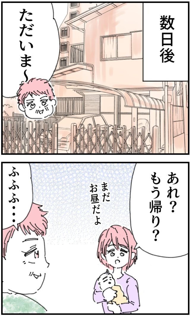 数日後。仕事中のはずのお母さんがお昼頃に「ただいま~」と帰ってきてかおりさんは驚きます。