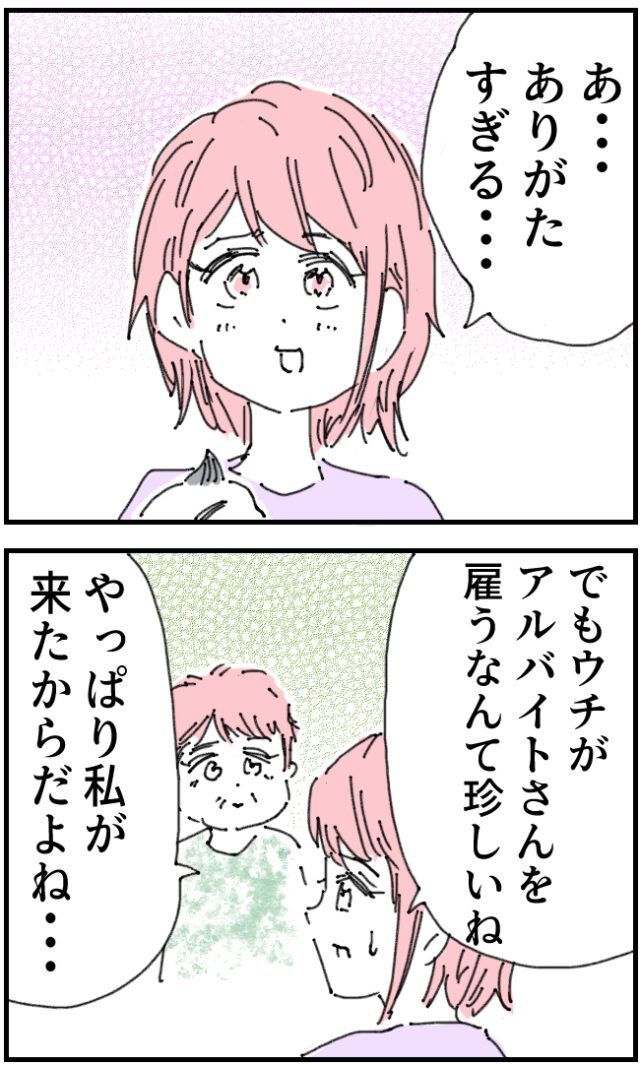 お母さんの言葉に「あ・・・ありがたすぎる・・・」と心から感謝するかおりさんですが、「でもウチがアルバイトさんを雇うなんて珍しいね。やっぱり私が来たからだよね・・・」と申し訳なく思うのでした。