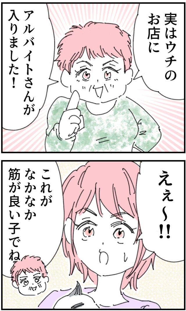 お母さんはフフフと笑みを浮かべながら「実はウチのお店にアルバイトさんが入りました!」と発表。かおりさんは「えぇ~!!」とビックリ。
