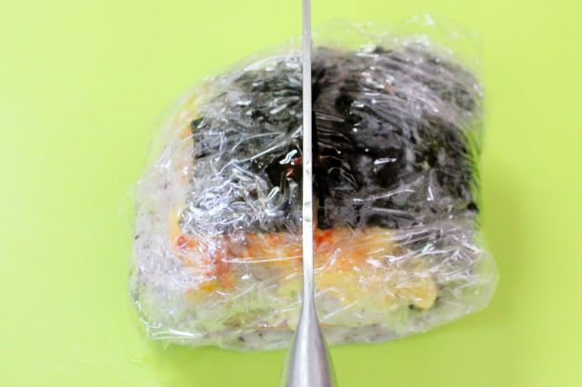 重ねたおにぎりが崩れないようにラップの上から包丁で切ってくださいね。ラップを外してお皿に盛り付けたら完成です。