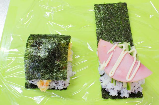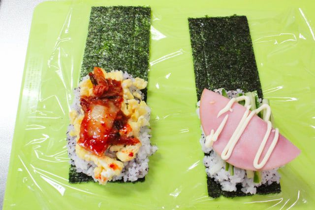 キムチ味の辛いおにぎりと、サラダのようなさっぱりとしたおにぎりの2種類を作ります。今回はハムを半分に折って斜めに乗せました。