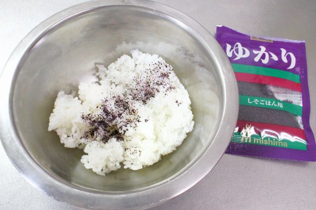 1. ボウルにご飯と赤じそふりかけを入れて良く混ぜます。