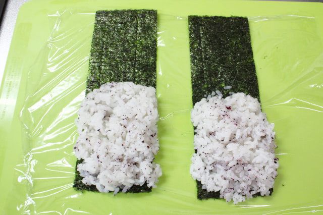 2. ラップの上に焼きのり2枚を置き、のりの手前に1を平たく乗せます。