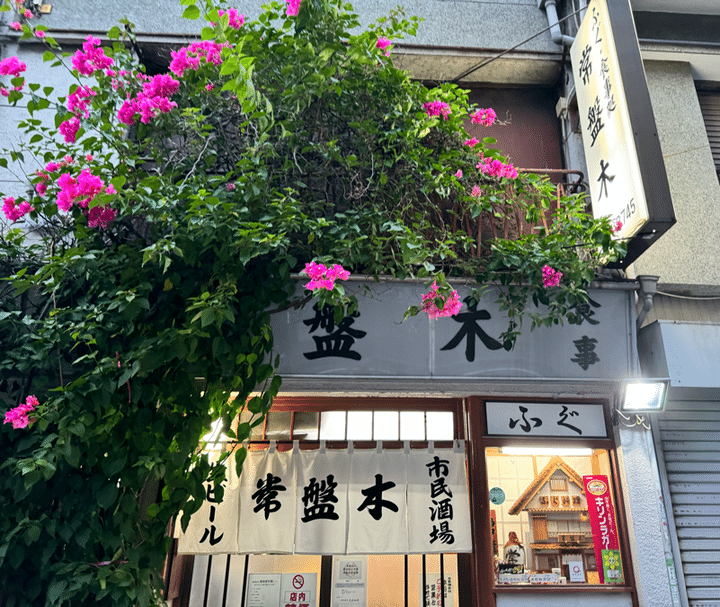 大正13年に創業したこのお店。昭和の感じが残っている入口。のれんには「市民酒場」ってしっかり書かれています。とっても大きなブーゲンビリアに看板が隠れてしまっていますが、このブーゲンビリアがお店の目印なので問題ないです。