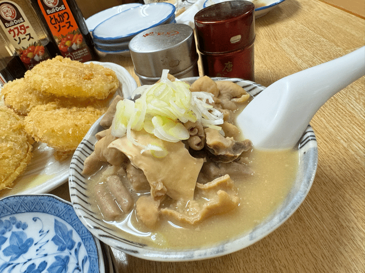 飲み屋さんの定番 もつ煮込み。いろいろな部位のもつが入っています。