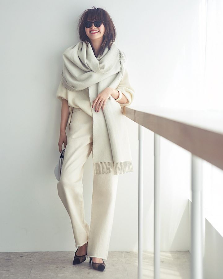 10月29日(木)、白のワントーンコーデを今年っぽく着こなすなら、くすみがかったオフホワイトでまとめるのがコツ。トレンドの大判ストールをゆるっと合わせて、シルエットに動きをプラス。やわらかいウール素材を選べば、女性らしくエレガントにキマります。足元はカットオフのデニムと黒のメッシュパンプスで、洗練さを演出。