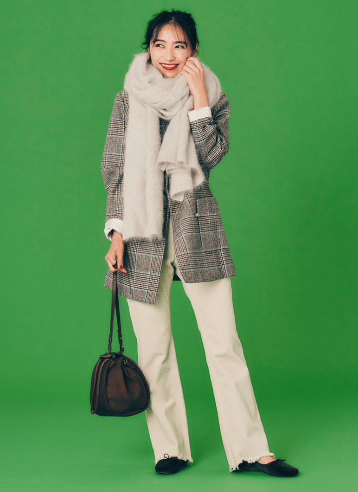 ストールとパンツを同系色で統一して、ふんわりとやわらかい印象に。チェック柄ジャケットも淡めのニュアンスカラーをチョイスすることで、マニッシュなコーデを甘めに更新。リボンのついたベロアパンプスで女性らしいアクセントを加えて。ストール¥59,000(アソース メレ/アイネックス)ジャケット¥39,000(アンティット)Tシャツ¥8,400(ティッカ)パンツ¥25,000(アッパーハイツ/ゲストリスト)バッグ¥23,000(JAMIRAY/(株)ジー)シューズ¥25,000(スペルタ/フラッパーズ)