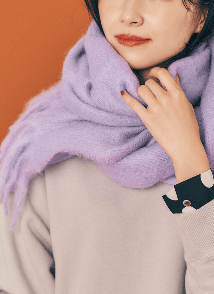 おすすめのストールコーデ④「ラベンダーカラー」×「スヌード風巻き」