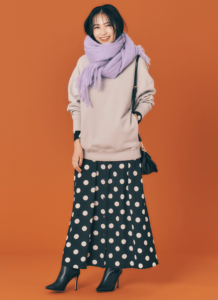 旬のラベンダーカラーとドット柄ワンピのフェミニンコーデを、ゆったりフーディでカジュアルダウン。袖からドット柄をちらりと覗かせて、可愛らしいアクセントを。小物は黒レザーで引き締めて、バランスよく。ストール¥22,500(アルテア/アンティット)フーディ¥19,000(アッパーハイツ/ゲストリスト)ワンピース¥15,000(ノーク)バッグ¥5,900(カシュカシュ/アンビリオン)ブーツ¥25,000(ダイアナ/ダイアナ 銀座本店)