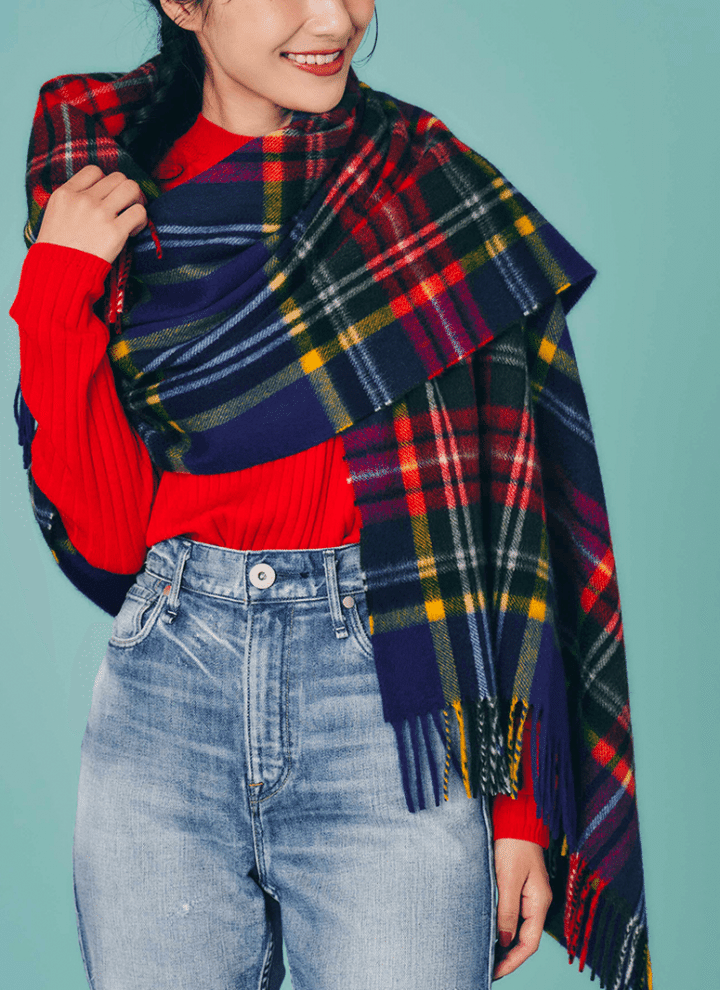 おすすめのストールコーデ②「チェック柄」×「ポンチョ風巻き」