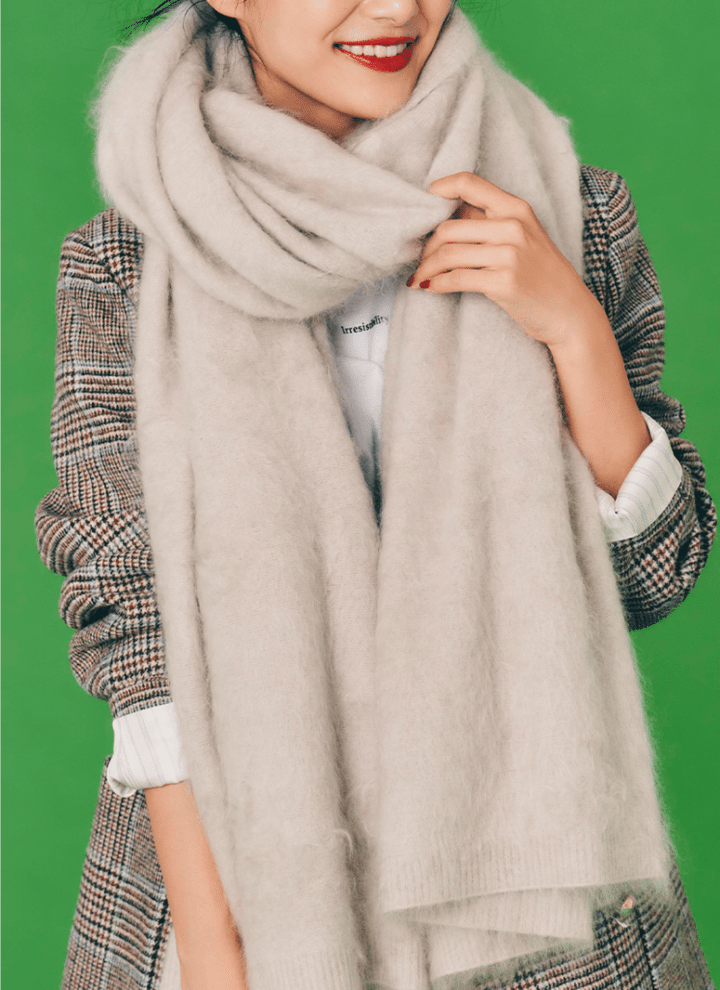 ふんわりと広がりやすい生地なので、ストールを巻きつける時に軽くねじりを加えるとほどよいコンパクト感に。全体はゆるっとまとめつつ、間延びを回避します。