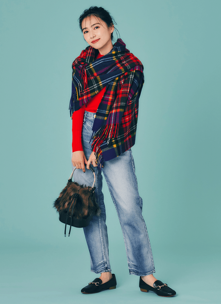 パッと目を引く赤のリブニットが、チェックの差し色とリンク。かっちりしたローファーを合わせて、鮮やかでまとまりのよいブリティッシュスタイルに。ボトムスは色落ちの効いた薄色デニムで、カジュアルな抜け感をプラスして。ストール¥57,000(ジョシュア エリス/グリニッジ ショールーム)ニット¥15,000(マイカ アンド ディール/マイカ アンド ディール 恵比寿本店)パンツ¥23,000(アッパーハイツ/ゲストリスト)バッグ¥33,000(ヴィオラドーロ/ピーチ)シューズ¥13,500(ダイアナ/ダイアナ 銀座本店)