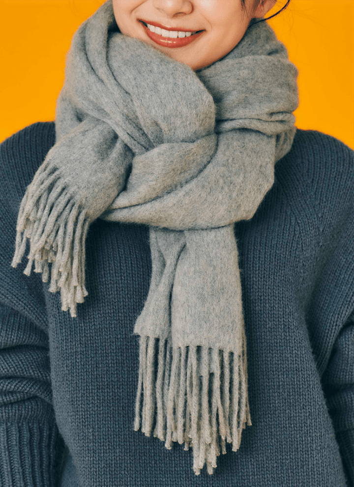 何重にも編み込んだような巻き目と、ボリューミーなシルエットがインパクト大。フリンジはしっかり見せる方が可愛く仕上がります。オーソドックスなストールだからこそ、巻き方は大胆に。