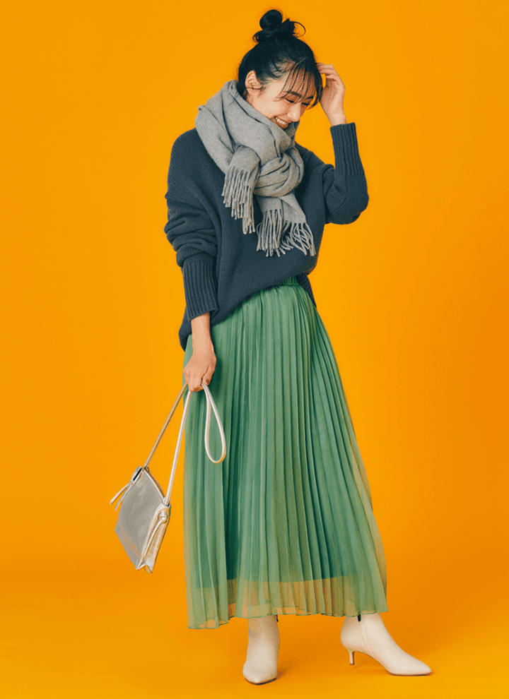 「ライトグレー×チャコールグレー×くすみグリーン」とニュアンスカラーが続くように色味をなじませて、今年っぽい仕上がりに。首元にボリュームがあり目線が上に集まるので、ゆる×ゆるシルエットでバランスよく。ヒールブーツとシルバーバッグで女性らしさもON。ストール¥69,000(ベグ アンド コー/ボーダレス)ニット¥13,000(アンクレイヴ/オンワード樫山)スカート¥16,000(ソーノ/ミラク)バッグ¥25,000(ADINA MUSE/ADINA MUSE SHIBUYA)ブーツ¥23,000(ダイアナ/ダイアナ 銀座本店)