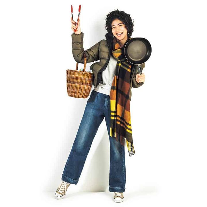 合羽橋に行くと帰りは絶対に大荷物になるから、動きやすい服装と大きめのエコバッグは必須。ストール¥57,000(ジョシュア・エリス/グリニッジ ショールーム)チェックかぶせ付きカゴバッグ¥72,000(エバゴス/マドリガル)スニーカー¥6,500(コンバース/コンバースインフォメーションセンター)ピアス¥16,000(カレンソロジー/カレンソロジー 青山)