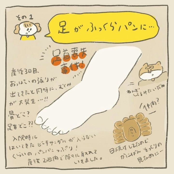 足や全身がむくみ、お乳はガチガチ…。1人出産したはずなのに、なぜか体重は増えている!前代未聞、産後の自分の身体の変化に戸惑うぽんぽこさん。