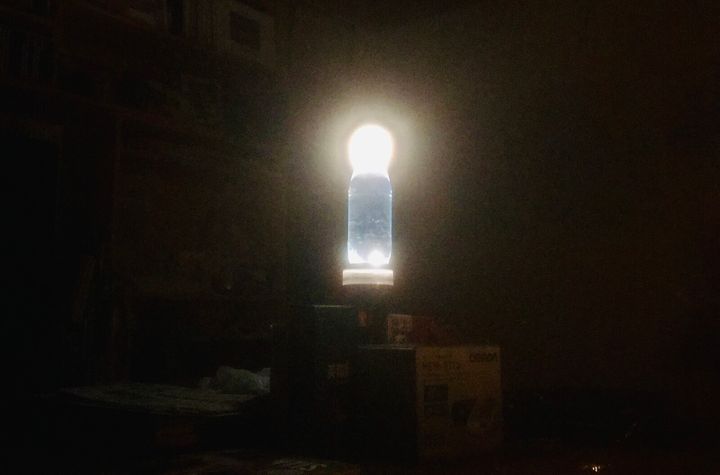停電中は水を入れたペットボトルを 懐中電灯の上に置くというライフハックを実践