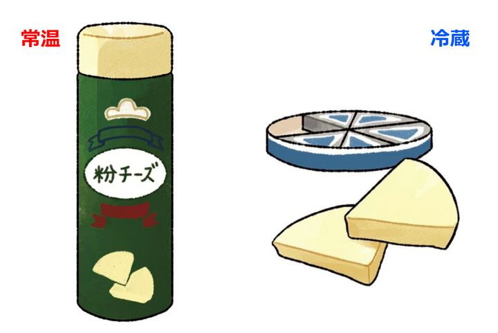 粉チーズは冷蔵室へ入れると出し入れの温度差で固まりやすくなるため、常温保存します。ただし、6月~10月は冷蔵室へ入れるのが安心です。そのほかのチーズは冷蔵保存を。