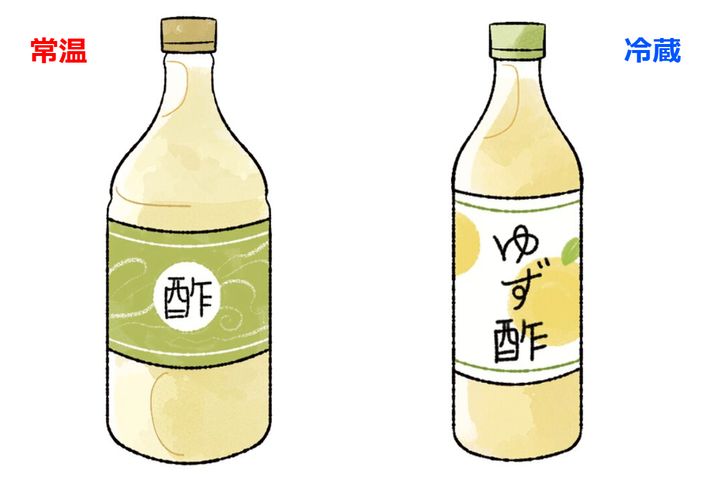 酢は殺菌力が強いので、常温保存でOK。ゆず酢などかんきつ類を絞ったものは、酸度が酢ほど高くなくいたみやすいので、冷蔵庫へ入れます。