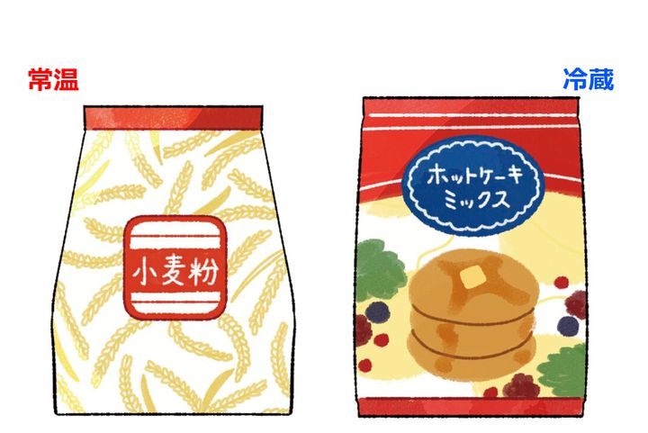 小麦粉は袋の口をしっかり閉じ、密閉容器に入れて常温で保存。中身を密閉容器に移し替えた場合も常温でOK。ホットケーキミックス、天ぷら粉、から揚げ粉、お好み焼き粉などの調味されたミックス粉は冷蔵保存を。