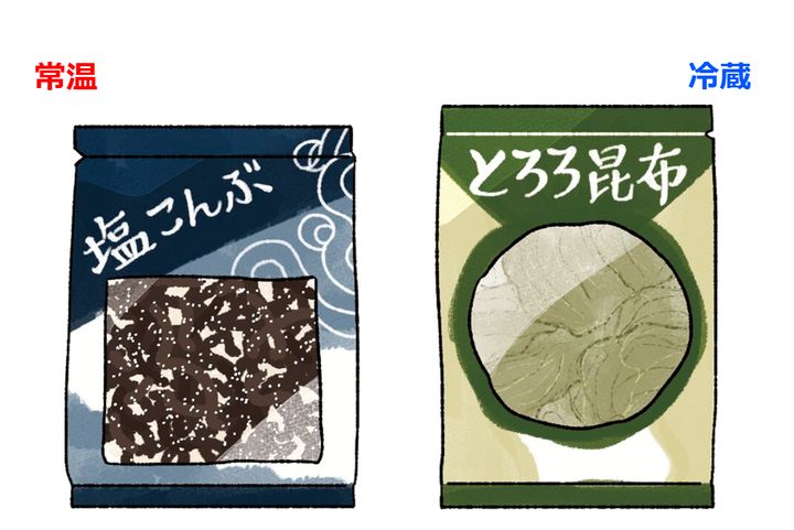 塩昆布は冷蔵庫に入れると、使うときの出し入れで湿気がついて固まる原因になるので常温保存を。とろろ昆布は変色しやすいので頻繁に使わないなら冷凍室へ。